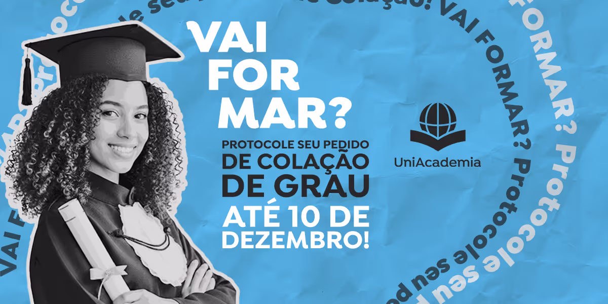 Agora, você precisa protocolar o pedido de Colação de Grau, até o dia 10 de dezembro de 2025. O pedido está sendo feito apenas de forma online, através de um formulário.